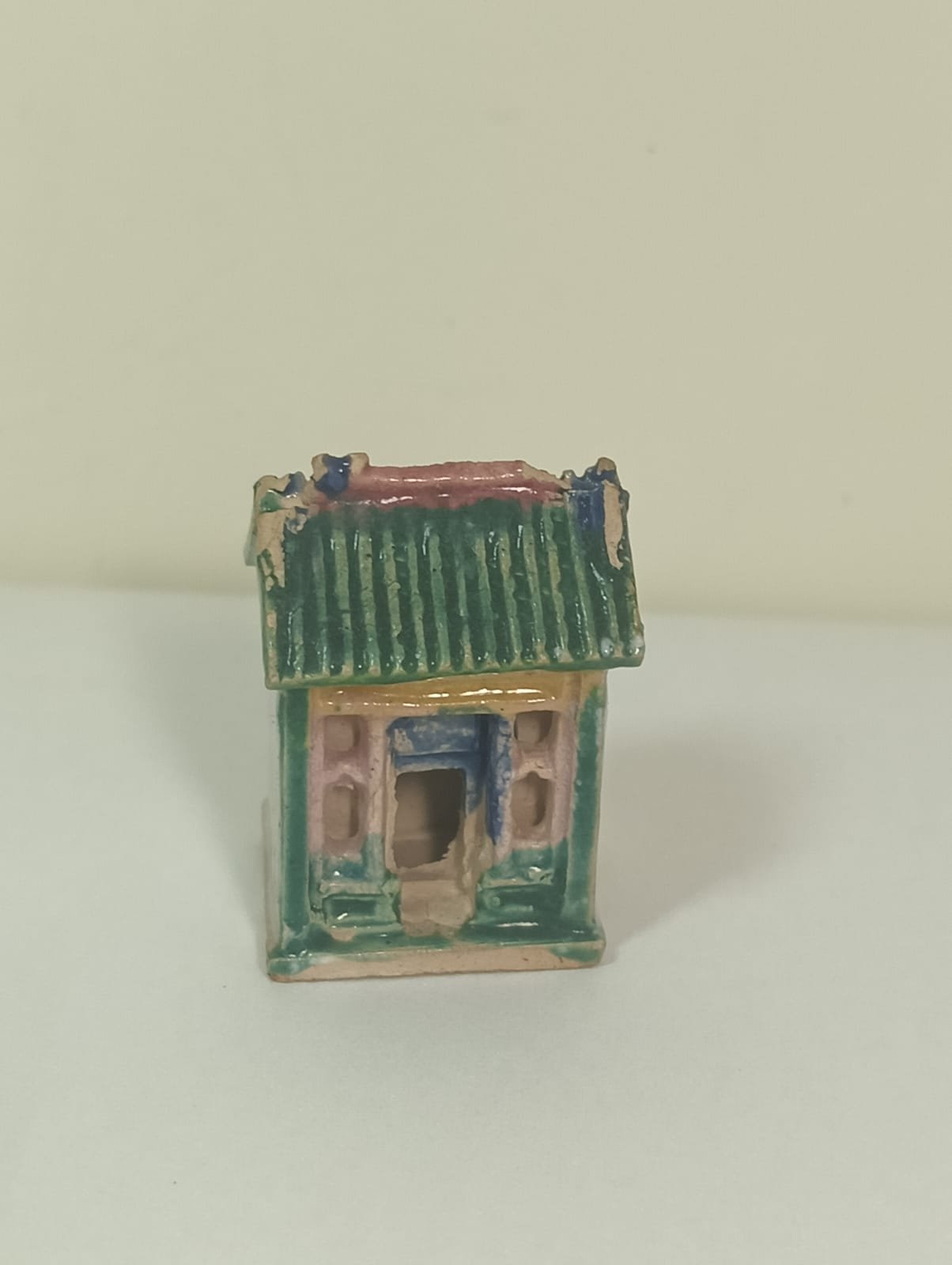 This very small hand-painted ceramic house figurine is an elegant addition to any collection or décor. At just 2.5 cm in height, it captivates with its intricate details and charming craftsmanship. Finished in soft pastel tones with a glossy glaze, it exudes a calming and warm aesthetic.The figurine showcases a textured roof and an open doorway. Minor chips and wear only add to its vintage appeal, making it a truly one-of-a-kind treasure for collection.